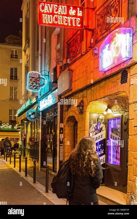 Caveau de la Huchette, ouvert en 1946, dernier club de jazz de l’après guerre. Enseigne rouge et banquette de cuir rouge.