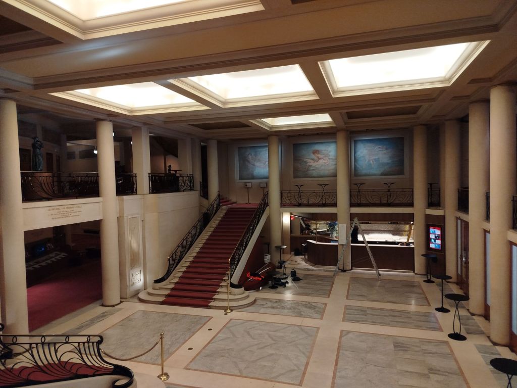 En façade, 6 cariatides, à l’intérieur une salle de 1500 places. En 1900, la lumière électrique en profusion de lustres en bronze doré signés Christofle.