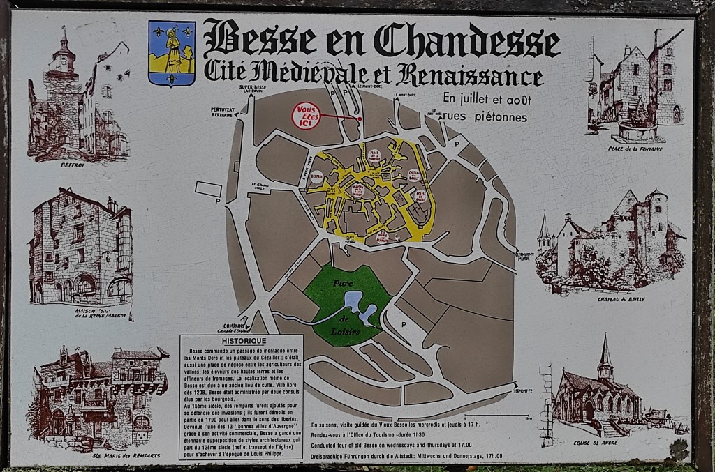 Lundi 17/04 – visite guidée avec Corentin de la ville de Besse, très puissante au Moyen Âge et après un déclin au 19e, c’est orientée, à partir des années 1960, sur le tourisme blanc.