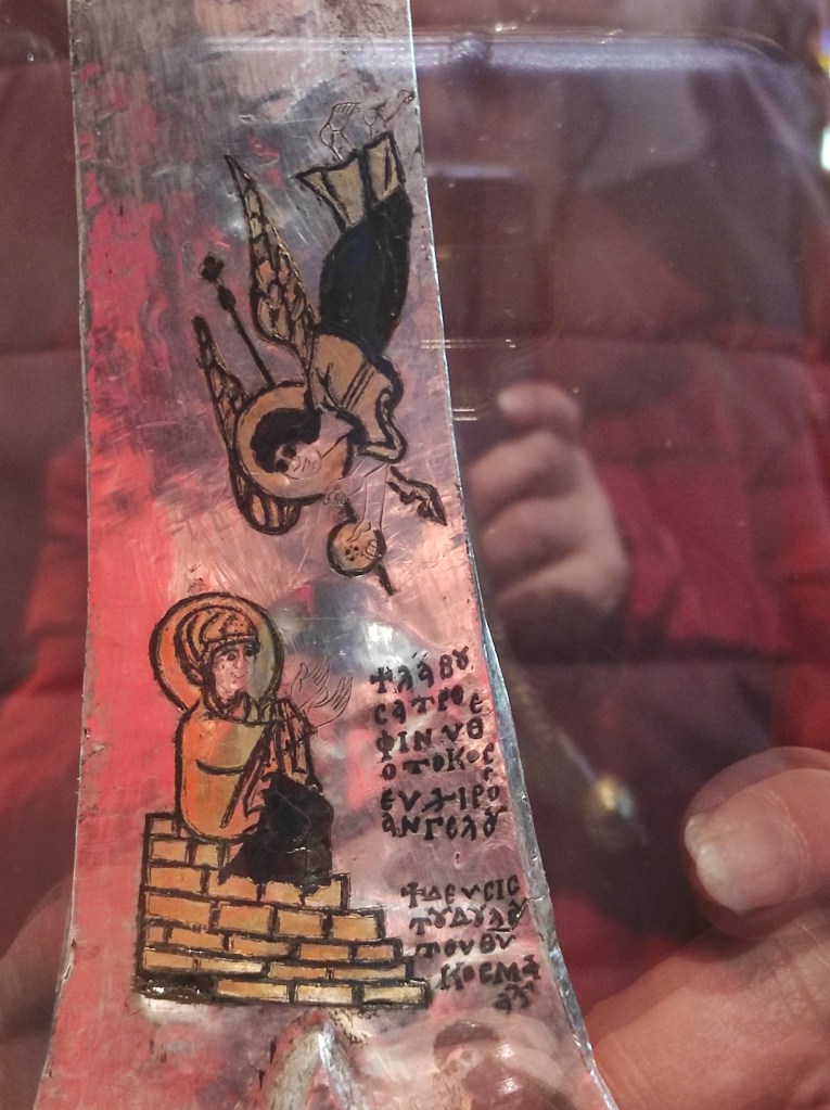 L’iconographie de la croix laisse supposer qu’elle était liée à une église consacrée à la Vierge. Elle était fixée sur une hampe pour les processions, conformément à un rite connu dans les sanctuaires byzantins.