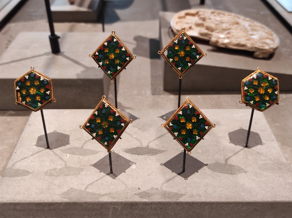 Ces plaquettes hexagonales et losangées appartiennent aux délicats « émaux de plique » : des motifs de trèfles, cœurs et cercles, délimités par de fines cloisons et remplis d’émaux opaques bleus, rouges et blancs, se déploient sur un fond d’émail vert translucide. Elles étaient sans doute cousues sur des vêtements.