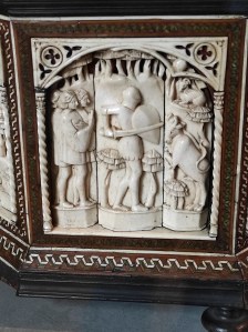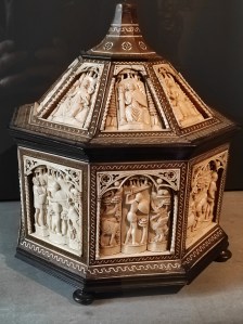 Ce coffret octogonal associe deux cycles de paquettes sculptées : sur le couvercle sont représentées les allégories des sept Vertus (les trois Vertus théologales : Foi, Espérance et Charité et les quatre Vertus cardinales : Prudence, Force, Justice t Tempérance), ainsi que deux porteurs d’armoiries ; sur les côtés se déroule l’histoire de Jason et de la Toison d’or.